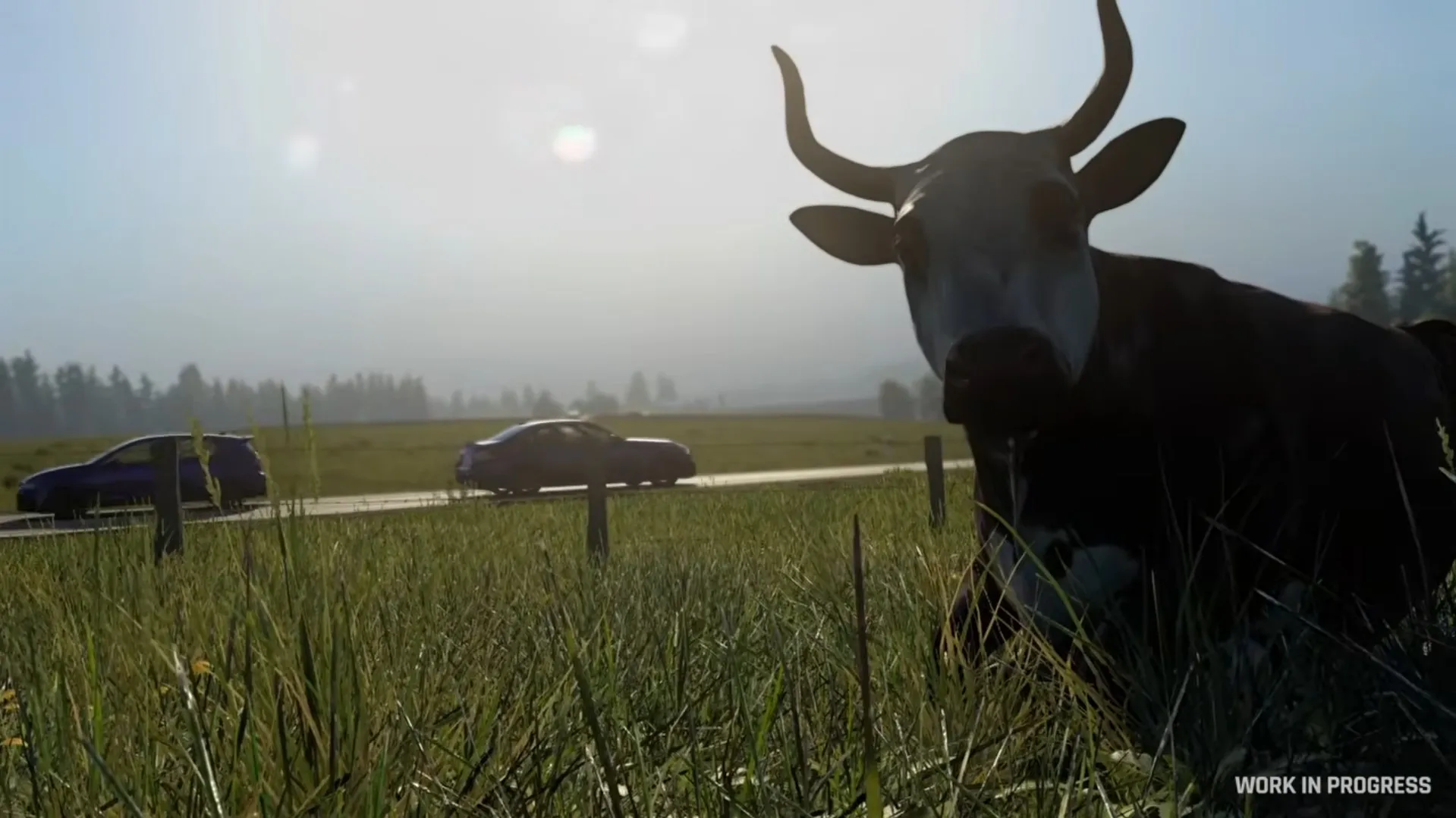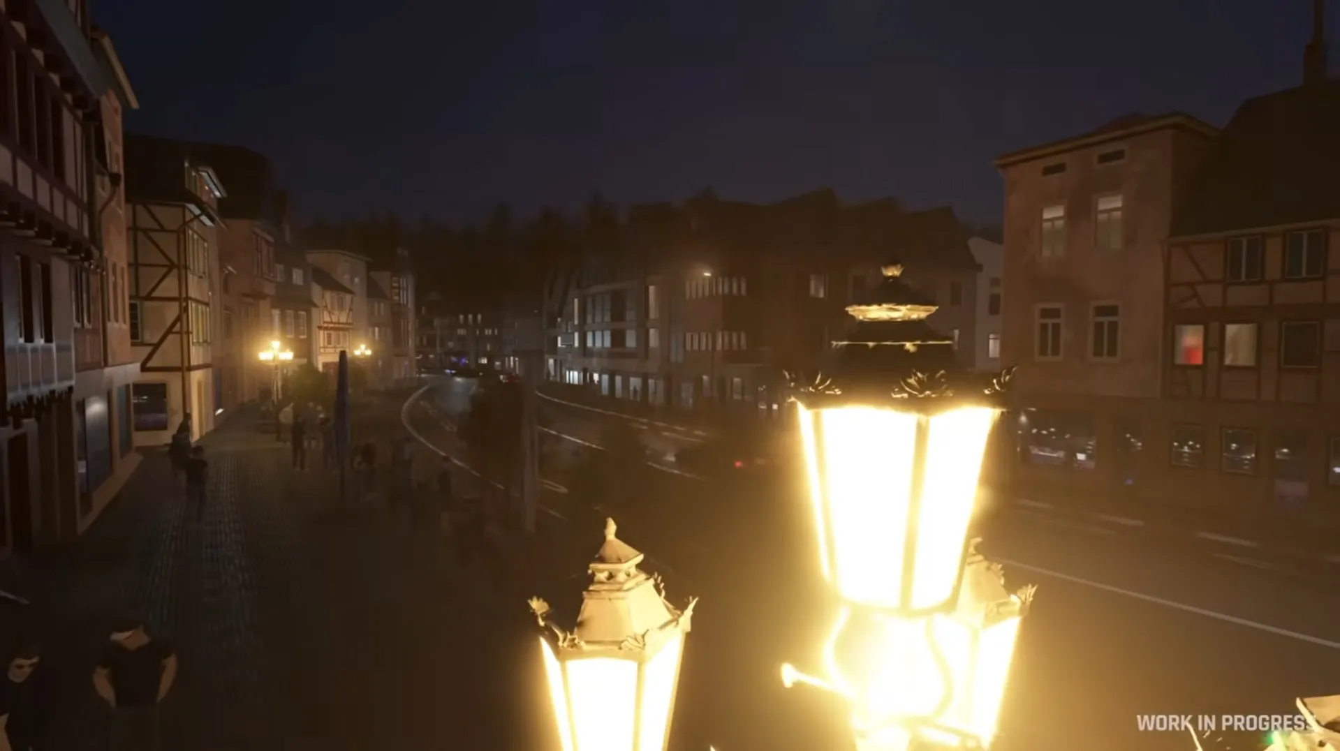 La vidéo dévoile une région Eifel densément peuplée avec du trafic contrôlé par IA, des piétons dans les rues d’Adenau la nuit, et même une vache animée dans les champs. On aperçoit des lieux emblématiques comme l’entrée principale du Nürburgring, le Cockpit Bistro à Adenau où la Nordschleife passe au-dessus de la ville, et l’intersection des routes B257 et B258 au nord de Müllenbach. Le tout bénéficie d’un cycle jour/nuit dynamique avec un éclairage urbain nocturne particulièrement soigné.